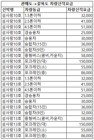 갈목도 차량선적요금은 다음과 같습니다.