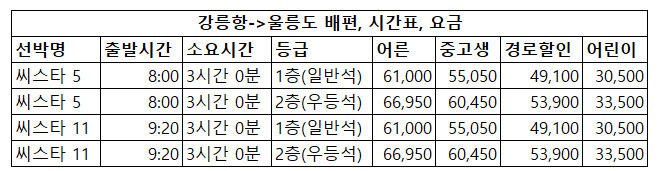 | 강릉항->울릉도 배편, 시간표, 요금 | |||||||