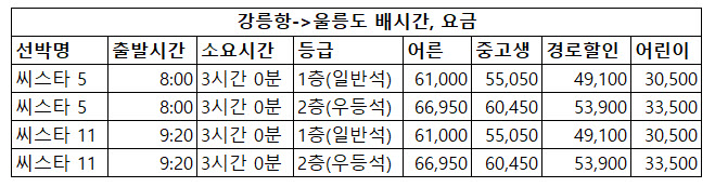 | 강릉항->울릉도 배시간, 요금 | |||||||