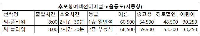 | 선박명 | 출발시간 | 소요시간 | 등급 | 어른 | 중고생 | 경로할인 | 어린이 |
