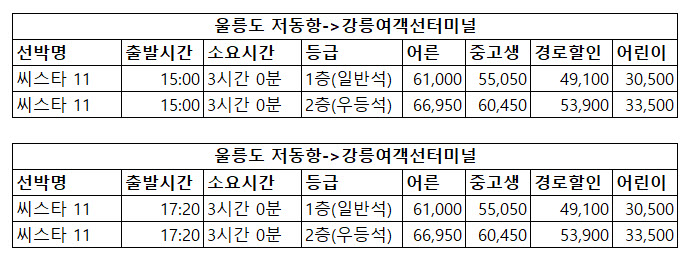 울릉도 저동항 강릉여객선터미널 배시간표, 요금 및 요금