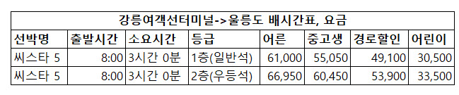 | 강릉여객선터미널->울릉도 배시간표, 요금 | |||||||
