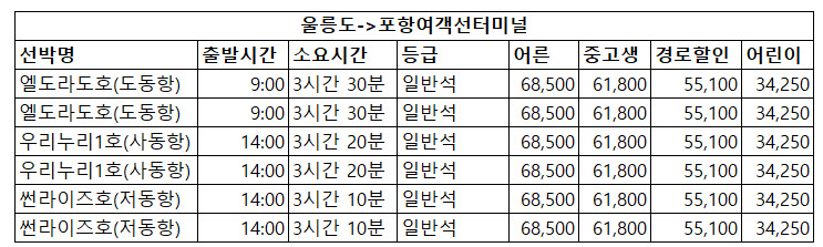 울릉도 포항여객선터미널 배시간표, 요금 및 요금