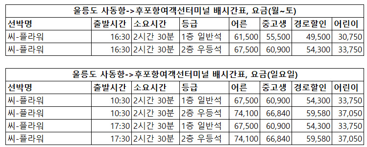 | 울릉도 사동항->후포항여객선터미널 배시간표, 요금(월~토) | |||||||