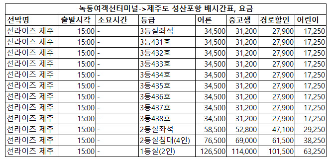 | 선라이즈 제주 | 15:00 | - | 3등실좌석 | 34,500 | 31,200 | 27,900 | 17,250 |