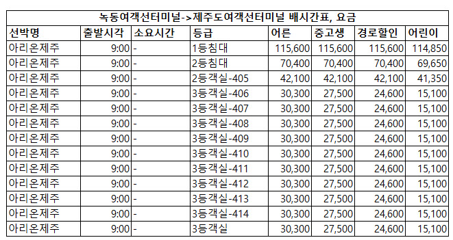 | 아리온제주 | 9:00 | - | 3등객실 | 30,300 | 27,500 | 24,600 | 15,100 |