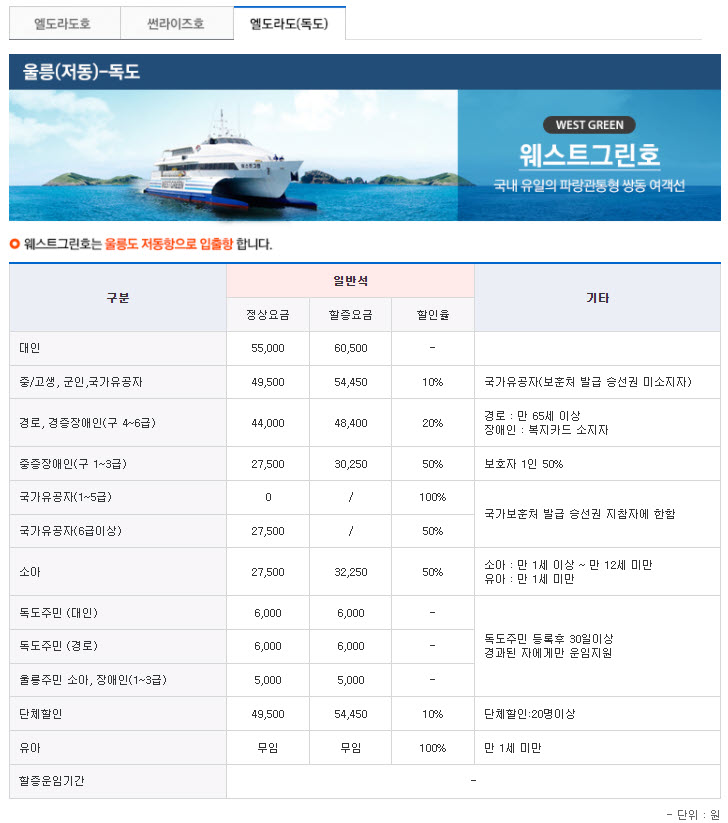 | 중/고생, 군인,국가유공자 | 49,500 | 54,450 | 10% | 국가유공자(보훈처 발급 승선권 미소지자) |