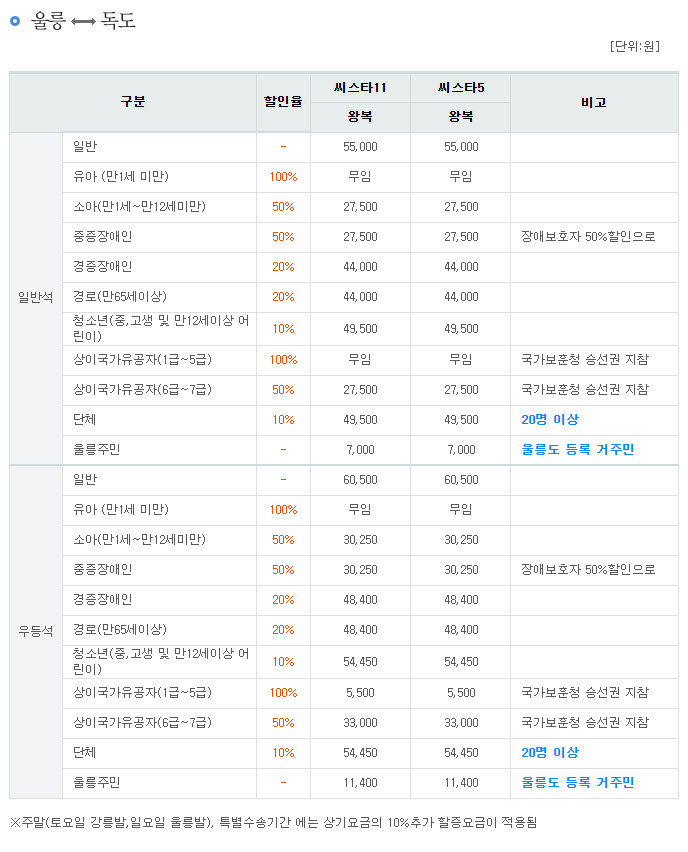 | ※주말(토요일 강릉발,일요일 울릉발), 특별수송기간 에는 상기요금의 10%추가 할증요금이 적용됨 |