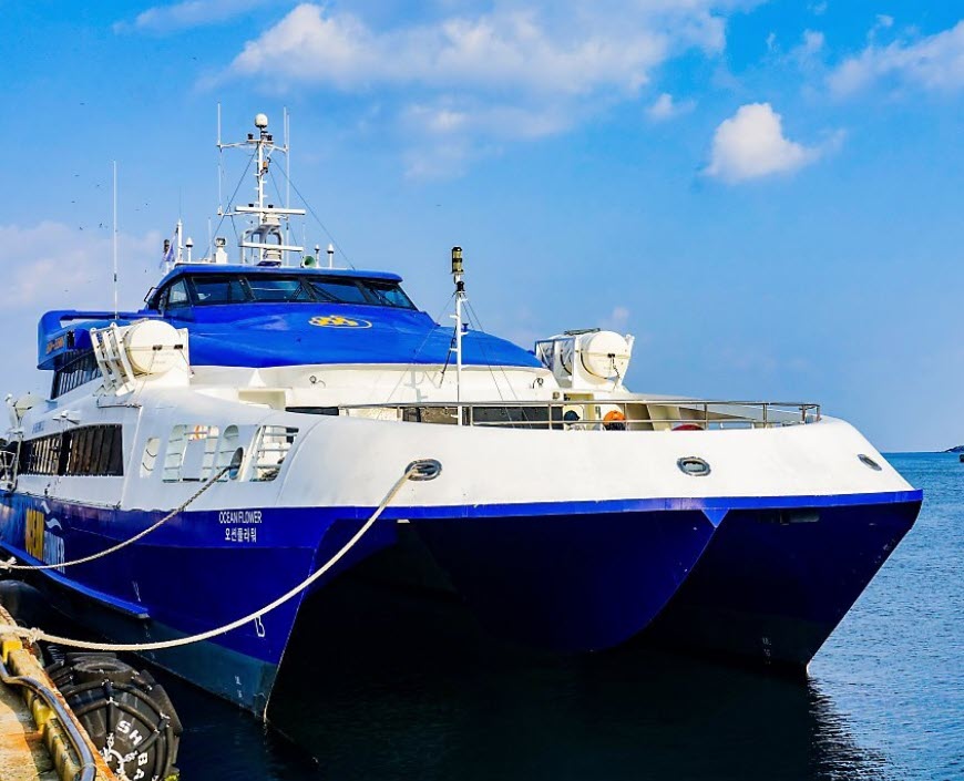 대아고속해운의 오션플라워는 알루미늄으로 건조되었습니다. 선체가 쌍동선으로 복원력이 뛰어납니다. 국내 최초 HSC(고속선)CODE를 FULL 적용하였으며 트림탭 및 T-FOIL로 선박의 롤링과 피칭을 잡아주어 안정성 높인 워터젯트로 설치된 쾌속선입니다. 편도 금액은 대아고속해운 공식 사이트 기준 부산-대마도 8만5천원 대마도-부산 9천엔으로 책정되어 있습니다. 성수기 및 주말에는 증편됩니다.