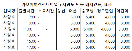 | 사량호 | 13:00 | - | 6,000 | 5,400 | 4,800 | 3,000 | |